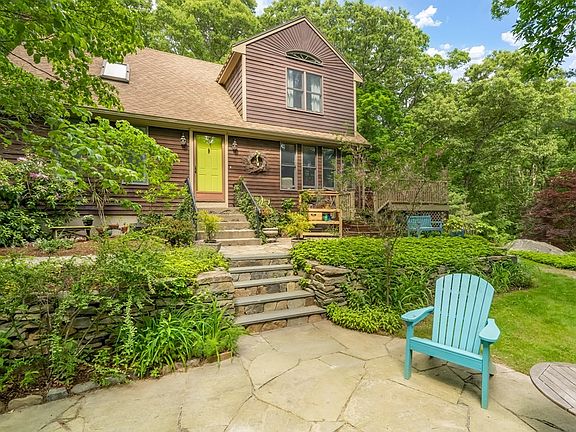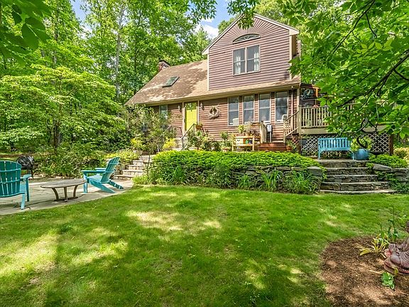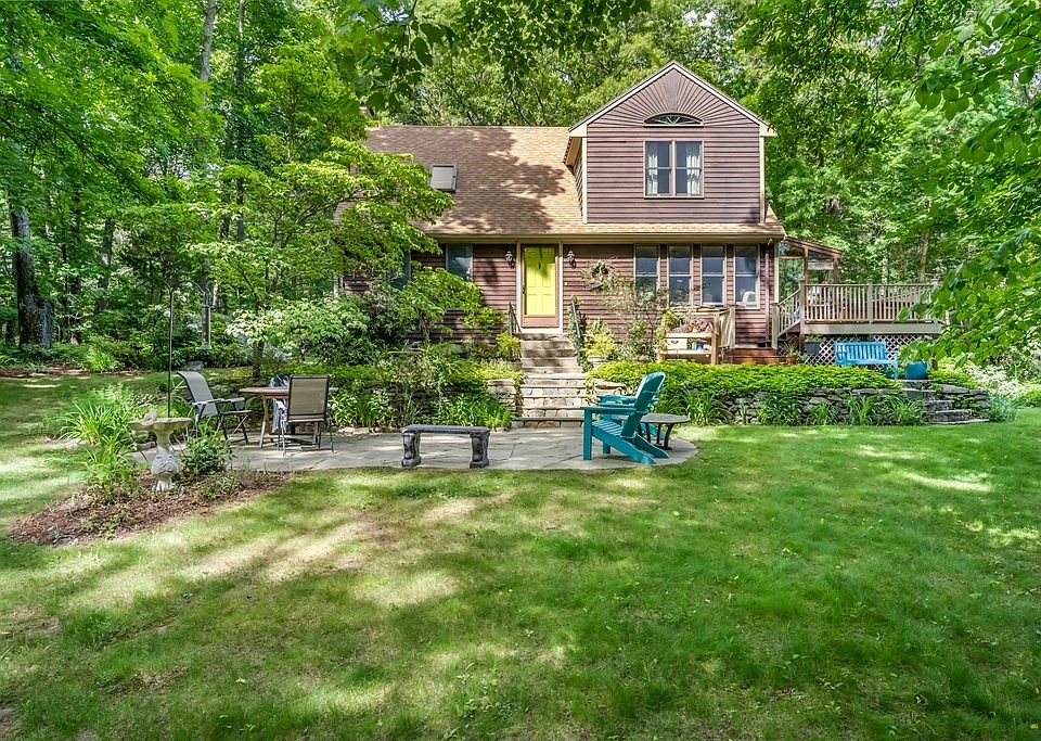 Find tranquility, south facing in this 3 bed, 1.5 bath Saltbox Cape w/ 2 car garage on 1.5 acres. This private property has perennial gardens, pudding stones & beautifully naturalized. Welcomed by two-tiered patio w/ fieldstone/blue stone accented strwy/walls,enter into LR w/ wood stove. Sunny 1st floor is highlighted by oak hrdwds,soap stone & quarry tile floor for a passive solar effect.Updtd kit w/ cherry cabinets,ctr island w/ dining area serves great for entertaining.Off kit,find cedar beam sunrm w/ floor-ceiling wndws w/ skylights & access to outdoor deck w/ built-in hot tub.Finish 1st fl is 1/2 bath & side entry to mudrm & laundry. Ascending the tall hllwy to 2nd floor, find full bath w/ tub,2 BRs and lg,bright primary BR,dble closets,built-in a/c & 1/2 planked ceiling.Also partial fin bsmt w/ heat, generator hookup,artisan well & kit appl,w/ wine fridge/washer/dryer included.New septic being installed by seller prior to closing. Deadline for offers 6/14 @ 12pm
