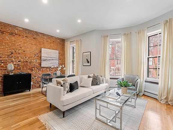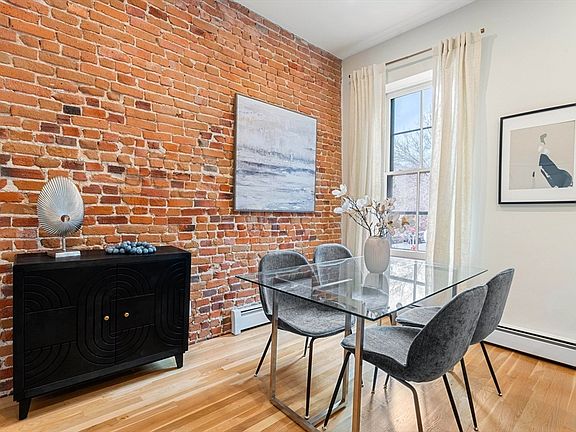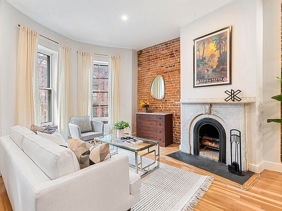 Quintessential South End two bedroom, two bath Philly duplex on ideally located Clarendon Street! One easy flight to your front door, open plan living and dining with high ceilings, bow front bay window, wood burning fireplace with original marble mantel, exposed brick and hardwood floors. Renovated kitchen with ample storage, stainless steal appliances and gorgeous Quartz counter tops. The spacious second bedroom completes the living level and is suitable for a combination office/guest with an over-sized en suite bath with a tub/shower combination, sliding glass doors lead you to one of two private rear decks. Second level features a primary bedroom suitable for queen or king sized bed and ample closet space, another private deck and private bath. In unit laundry, pet friendly, A/C and extra storage in the basement make this a rare offering.