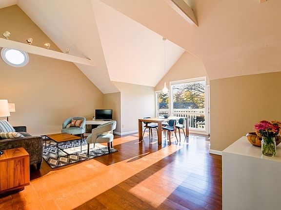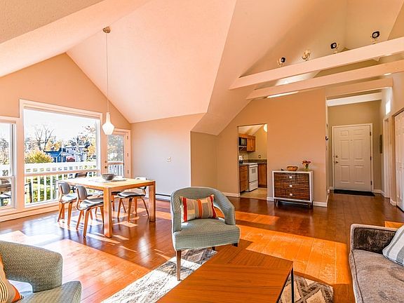 Enjoy both sunrises AND sunsets from this sunny and beautiful end-unit condo just a few blocks from downtown Northampton! This top-floor unit features cathedral ceilings throughout, picture windows in the living and bedroom, skylights, an open floor plan, and a balcony overlooking a quiet side-street. Additional highlights include custom soft-close kitchen cabinetry, granite countertops, in-unit laundry, lots of closet space, and a full bath that opens to both the bedroom and the living room. In addition to having no one above you, this unit shares NO walls with any other unit. Included: two deeded off-street parking spots, a 10 x 10 dedicated storage space in the basement, and a backyard enjoyed by all residents. Professionally managed by Kendrick Property Management. Walkable to Smith College, Forbes Library, restaurants, music venues, art galleries, shops, & the bike path. Easy access to I-91. Enjoy the bustle of downtown from this beautiful, quiet, and move-in ready home!