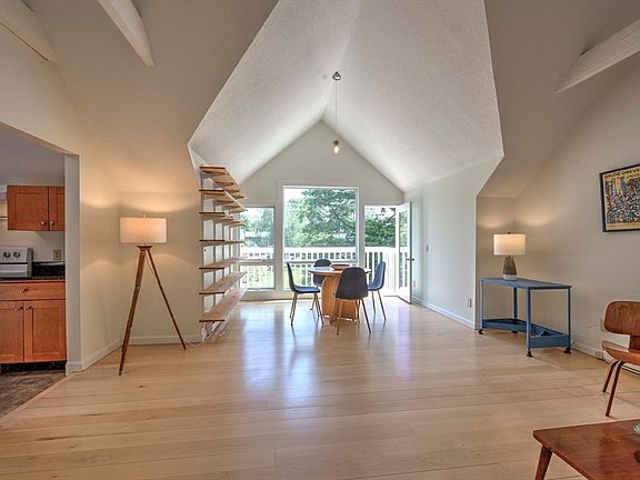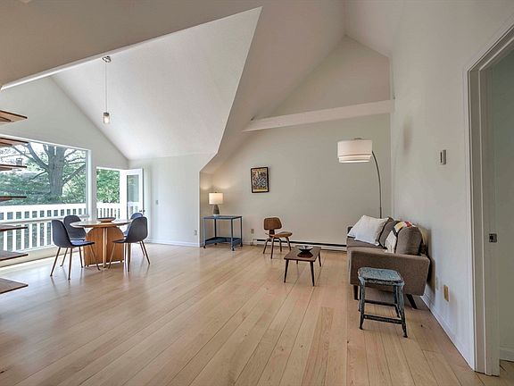Modern and pretty top floor garden condo in the heart of Northampton on the Manhan Bike Trail. Walk to the great shows & restaurants & cafes in just 5 min. This home will likely be the coolest place you'll ever live: vaulted ceilings with dining space w/ useful book or display shelving for at-home work days and a huge picture window over-looking a private deck/balcony (new Trex deck), granite kitchen w/ updated appliances, refurbished blonde maple floors (very sexy), top-of-the-line all-new Marvin Integrity windows everywhere facing full foliage trees & privacy, ample bedroom & closet space, bathroom with tall ceiling with skylight--superb natural light. Every inch of this space is repainted June 2025. Newer mini-splits heat and cool, secured storage in basement. Entertain, have coffee on the deck, step out for dinner, or stay home & cook. A delight, easy to own & maintain. Laundry in-unit. Snazzy, very well-maintained, pleasant, and clean. Kendrick Management (see Disclosure).