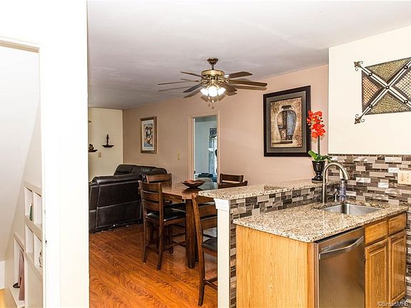 Bright and Sunny End unit Townhouse 3 bedroom 2 1/2 bathroom with a first floor MSB suite and walk in closet this unit features an open kitchen, dinning room, living room floor plan. Granite countertops with new kitchen tile flooring, dinning room, living room has new laminate flooring with French doors leading to a small deck. Upper level bedrooms include full length windows for full sun exposure along with double closets double bathroom sinks and larger bedroom ceiling fan. Lower level Family room includes big screen theater setting with slider to exterior open space common area. These units include a detached garage with additional parking