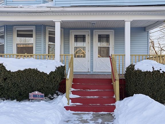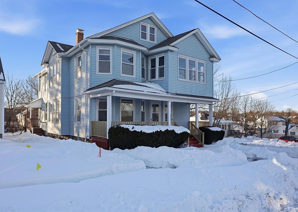 A welcoming covered porch introduces this much-loved two-family home, held by the same family for more than two decades. Set on a quiet neighborhood side street with easy highway access, the property offers an appealing blend of comfort, convenience, and long-term potential. Low-maintenance vinyl siding and hardwood floors throughout provide a solid foundation for future updates. Each unit features 2 bedrooms, 1 full bath, a comfortable living room, and an eat-in kitchen with pantry and in-unit laundry. The first-floor unit includes a flexible office or guest room, while the second-floor offers a spacious dining room. An oversized detached two-car garage provides excellent storage, and the large, recently surveyed yard enhances outdoor appeal. Both units are vacant and ready for immediate occupancy—ideal for investors, extended family living, or owner-occupants seeking a smart mortgage helper. Live in one, rent the other, and build equity from day one.