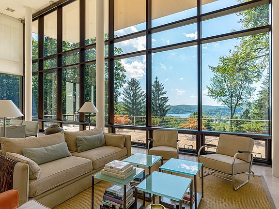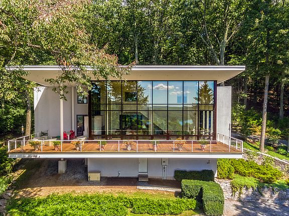 Listed by Madonna & Phillips Group. Elevate your mind, spirit, and lifestyle in this exceptionally architected Modernist house perched atop a hillside overlooking Lake Waramaug and adjacent vineyard. Set back from the road on 2.6± acres with beach access and unobstructed water views, here you'll find the most wondrous setting--layers of hills, lake and sky--stretched out before your eyes, and at once feel worlds away in your own treetop hideaway.The sophisticated light-infused open-plan layout includes approximately 3,200 square feet of living space, wraparound lakeview decking, plus a 1,900 square feet walkout basement with storage. The structure rests on a poured concrete foundation, and the entire house is built on a post and beam steel.The main level living area flows seamlessly between the eat-in chef's kitchen and a colossal atrium with 18ft tall windows that sets a dramatic stage for large-scale entertaining: dining and lounging fireside by the wood-burning granite fireplace. Fitted with tongue-and-groove white oak flooring, the atrium opens to a lakeview deck spanning the width of the house, east and south, with an extended roof that creates a 14-foot canopy. The expansive deck makes for easy indoor/outdoor entertaining with built-in grille, outdoor speakers, dedicated lighting for al fresco dining, and separate access to the first floor Master suite with Moroccan ceramic tile bath. At the opposite end of the Master is a media room with built-in speaker system, built-in shelving, and its own powder room. The upper level captures much of the natural light from the atrium, and has two guest suites -- both tiled in Baumaniere Light French limestone, and one fitted with a Jacuzzi tub -- plus a generous family/media room. Situated downhill between the road and the main residence is a rustic studio with two stone fireplaces and half-bath. Closer to the main road is a separate two-car garage. Other highlights include full house generator, interior & exterior alarm systems; Miele appliances: dryer, dishwasher, double electric ovens; marble surround for the cook-top is Calacatta Luna, and Garland six-burner cook-top; 24-bottle wine cooler.A perfect country escape on the most perfect country road...Curtiss Road is a dead-end road, therefore, limiting traffic to residents, visitors, and makes for safe wonderful walks all the way to the end approximately two miles. A turn onto Hopkins Road will bring you to the Inn and Vineyard, continue and you encounter the Lake Waramaug perimeter road, an 8.2-mile loop. The Lake Road is ideal for walking, running, and biking since traffic is very accommodating. 90 minutes to NYC.About the town of Warren, ConnecticutWarren, a bucolic Litchfield County town, has long been a haven for residents seeking quiet and solitude amid a setting of rural beauty. It became a separate town in 1786 after splitting away from Kent, and was named in honor of the Revolutionary War hero Joseph Warren, who died in the Battle of Bunker Hill. Warren is adjacent to the larger towns of Washington and Kent. Residents enjoy boating and other water sports as well as the public tennis courts and town beach at Lake Waramaug. The scenic lake is nestled among surrounding hills, and along its edge are grand homes, lakeside cottages, several inns and a vineyard overlooking the water. Lake Waramaug is the second largest natural lake in Connecticut, covering 672 acres. Warren also has a small state park in Above All State Park, which offers unrivaled views of the surrounding countryside.