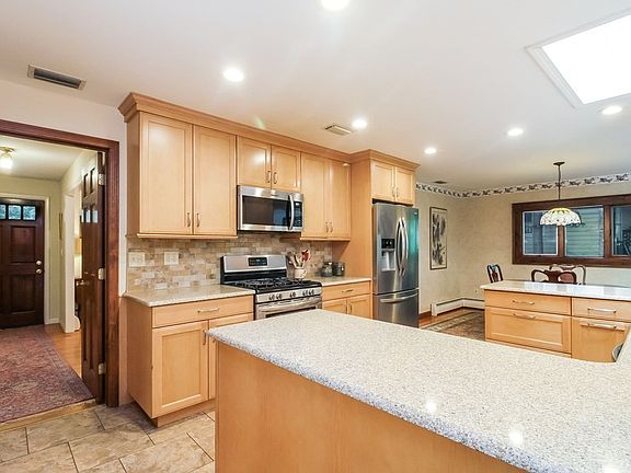 Nicely updated ranch features inviting interiors & convenient location w/i short distance to schools. Spacious living room has hardwoods, fireplace & large bow window. Remodeled kitchen (’15) showcases Brookhaven cabinetry, skylight, quartz countertops, tiled backsplash, stainless appliances & wide open to dining area & dramatic great room beyond. Great room highlights vaulted beamed ceiling, new carpeting smoothed ceilings & paint, gas fireplace w/oak surround & convenient 1st floor laundry closet. New oversized Andersen French door slider (’21) w/half-moon transom leads to composite deck & private backyard. Bedroom wing has remodeled full bath ('21) w/tile flooring, tiled tub/shower & white vanity w/quartz top, two bedrooms w/hardwoods & double closets plus primary suite w/hardwoods, walk-in closet & ¾ bath. Lower level offers additional finished room/home office, half bath & great storage in unfinished space. Seller owned solar panels ('20) help offset expensive electric bills.