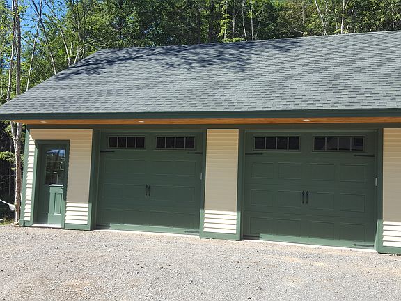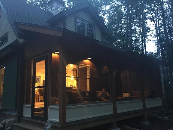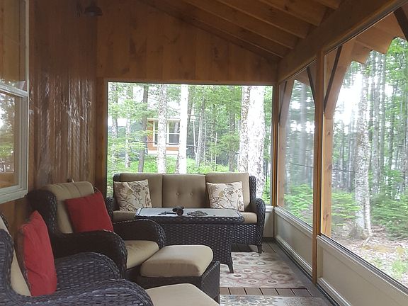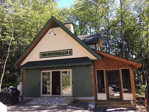 Carriage house style cottage with screen porch and large garage with 250' of deep water frontage and 1 1/2 acres on Ironbound Pond. Beautiful lot, one of the nicest on the pond! Septic system and well installed. lot and systems are pre-planned for a full year round home. This is set up as a seasonal camp but could be year round. It is on posts set on concrete rounds. First floor is a one room kitchen, living , dining plus a full bath. Very spacious for the size! This floor has a propane hot air furnace for heat. There are washer and dryer hookups in the loft. Second floor is a large loft with enclosed toilet and a sink. There is closet space along the outside eave walls in the loft. This loft has a heat pump for heat and a/c. On hot days the a/c keeps both floors cool. Walls and ceilings are insulated. Windows and slider are Paradigm. There is a well and septic system. The water is heated with a propane fired demand water heater. The front of the screen porch is about 150' from the water's edge, with a gentle sloping lawn to the water.