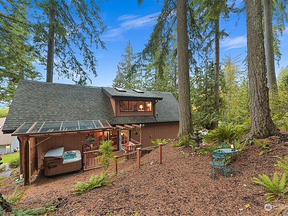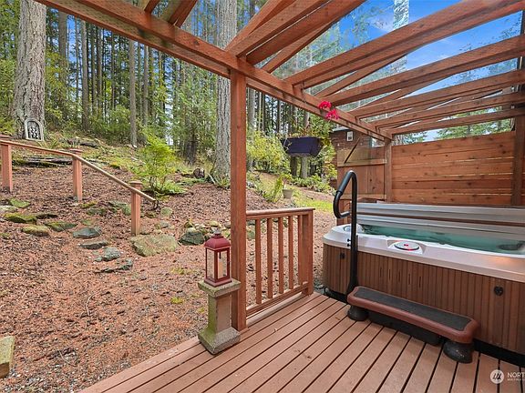 This magical property is simply unparalleled. Situated on a triple lot, it offers ample space and privacy. Nature enthusiasts will delight in the trail from the French doors of the den that recedes into the serenity of the woods. The chalet architecture exudes charm, complemented by a wrap-around deck that invites outdoor living. The private Jacuzzi offers soothing forest views providing the perfect oasis for relaxation. Inside, discover a cozy loft and a charming reading nook, perfect for unwinding. Built to stand the test of time it's secured to the bedrock beneath and built of sturdy Douglas Fir. A full home warranty is included that will cover any HVAC, plumbing, electrical or appliances issues for your 1st year of ownership!