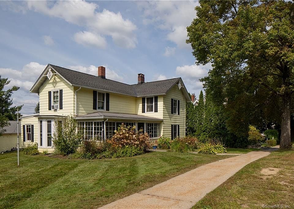 Charming historic home located within the sidewalk district downtown. Large yard with beautiful perennial plantings. Enter through a large enclosed porch with slate floor that adds extended living space in the warmer seasons. The first floor boasts spacious rooms with a beautiful curved staircase leading upstairs. The living room features a fireplace (currently an electric insert in place) and a cozy alcove that is perfect for houseplants or relaxing with a good book! There is an additional family room with new laminate flooring, dining room with built in hutch, kitchen with breakfast bar and a first floor bedroom! Upstairs are two large bedrooms with a dressing room and connected full bath. The town classifies this home as four bedrooms - the dressing room could serve as a small bedroom or home office. There is a connected barn/garage that can house one vehicle with a space behind that for a workshop/storage area. There is also storage upstairs over this area. The large yard has invisible fence, a private stone patio and plenty of space for play! With finishing touches this home will be an amazing showcase! All room sizes are approximate.
