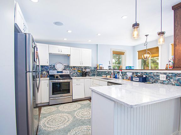 Indulge in culinary creations in the kitchen, where new interior flooring sets the stage. Custom cabinetry adorned with quartz countertops and a mosaic glass tile backsplash exude sophistication. A built-in banquette seating adds a touch of intimate charm, while the first-level bathroom features a walk-in tiled shower for an indulgent spa-like experience. Descend to the lower level to discover yet another thoughtfully designed bathroom. Stay cozy year-round with two brand new Heat pumps and a selection of electrical heating units.