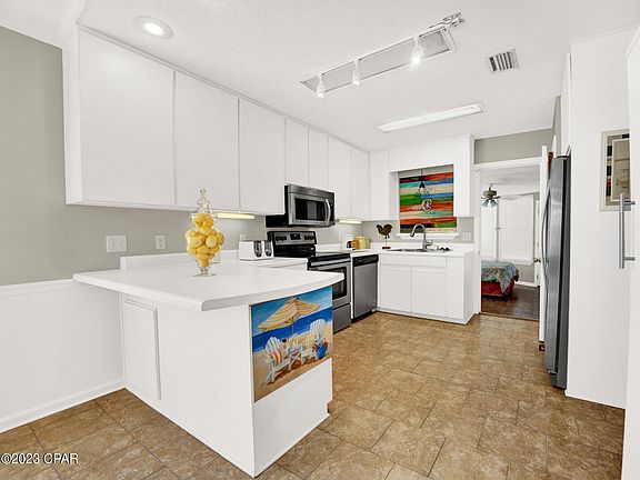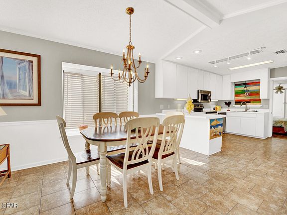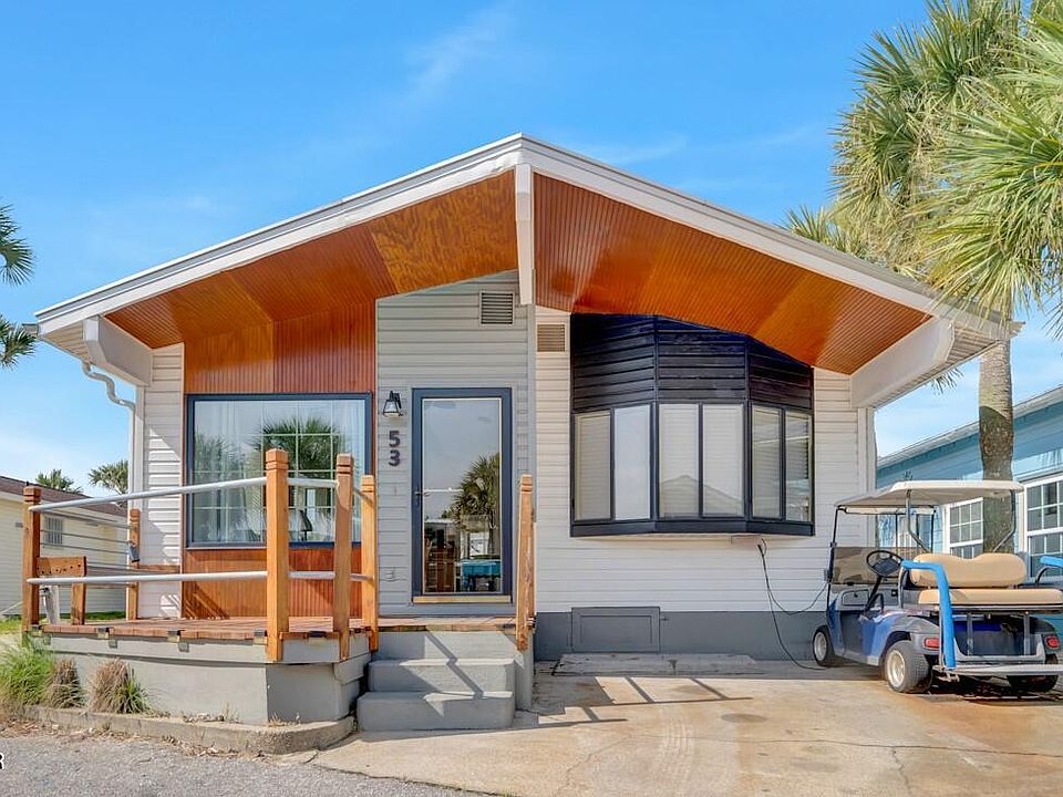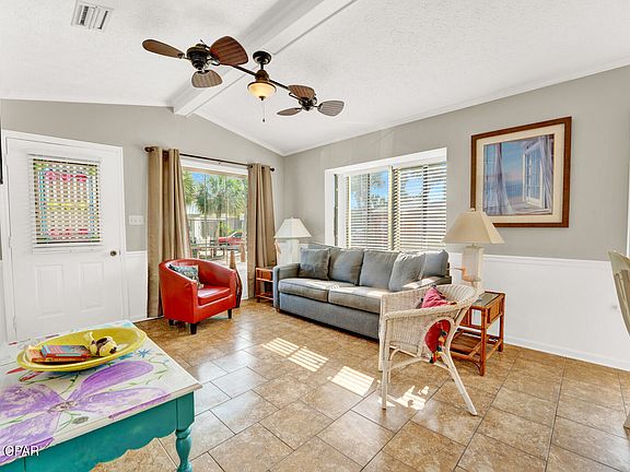 ONE OF A KIND.....THAT'S WHAT PEOPLE SAY ABOUT VENTURE OUT!!! A wonderful beach community where you can spend all your time enjoying the many amenities with no need to leave the property. Venture Out offers: beach and bay access; 2 pools (beach side and at the lagoon); tennis; pickleball; mini golf; shuffleboard, a playground; a fishing pier; a boat dock with slips and a boat ramp. And, owners bring your pets! This home is spacious (1140 sq. Ft.) with 2 bedrooms, 2 bathrooms and a large bonus room. It's location within the resort is perfect! The kitchen features stainless steel appliances (including a dishwasher) and lots of cabinetry. There is also a separate laundry room with full size washer and dryer. Roof was replaced in 2021, living room and dining room windows replaced in 2019, HVAC replaced in 2022. ''Golf carting'' is very popular in this gated community. Furnishings and golf cart included. From the back porch you can view amazing sunrises and sunsets! Bordering St. Andrews State Park provides the perfect place to experience nature while biking, hiking or taking a quiet stroll. Residents and visitors enjoy Venture Out's 300 feet of pristine beach on the Gulf of Mexico and it's 1,000 feet on Grand Lagoon! Just a short distance to many restaurants, including the locals' favorites! (Schooners, Patches and Capt. Anderson's to name a few.) If being on the water is your priority, no problem. Launch your boat at the dock and you will be in the Gulf of Mexico in minutes! So, if you are looking for a wonderful primary residence, a fun second home, or a great rental investment check out this property. Venture Out has it all and then some! Sizes and measurements are approximate. If important to buyer, please verify.