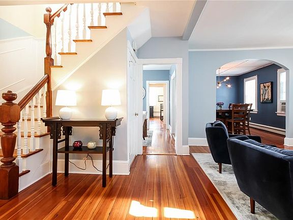 Turn-key, spacious downtown home ready to fill with your friends and family. First floor spaces include enclosed front porch, dining, living and family rooms, an eat-in kitchen, full bath, and a flexible ensuite bedroom/office with a separate entrance. A renovated master suite is on the 2nd floor with 2 additional bedrooms and a full bath. The sunny 3rd floor has 2 bedrooms. Exterior features include a 2-car garage, patio, back yard. New roof and skylights in December 2018. Walk a few blocks in any direction to Newport's history, food and fun: Bellevue Avenue mansions, Thames Street shops and restaurants, or harbor-front King Park.