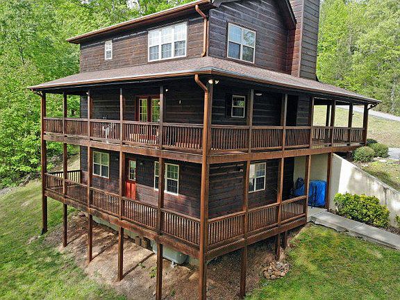 Incredibly well kept home with master on main and on upper floor! In better than new condition, just stained! Hardwood floors on main with nice rock floor to ceiling fireplace, roomy great room with cathedral ceilings! Custom kitchen has granite countertops, top of the line appliances, new sink, exits to spacious wrap around covered porch! Has roomy loft with closet which could be 3rd bedroom! Full finished basement has electric fireplace, lots of windows and full bath with really nice finish work and full covered porch off back overlooking small creek and mountain views! Detached garage, cement walkways,, fire pit and much more! This home really does show pride of ownership!