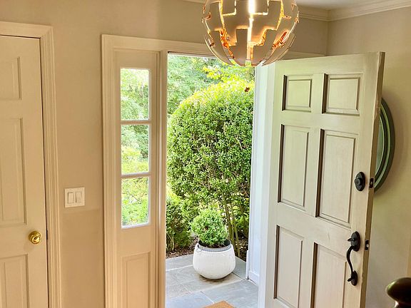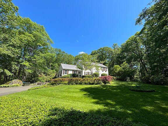 Beautiful colonial-style New Canaan home located on 6+ acres, off a private road. The spacious, sun-filled 5-bedroom, 4-bath home was renovated in 2022. There are wood floors throughout the home. The large kitchen features stainless steel appliances, stone countertops, a stone island, and double ovens. Enjoy the open concept in the kitchen, breakfast area, adjacent spacious dining room, and expensive family room which features a wood-burning fireplace. This room leads out to a spacious porch and a large yard where you will enjoy beautiful greens and flowers from early spring to late fall. Entertain family and friends in the cathedral-ceiling great room with a stone wood-burning fireplace, a wet bar, custom bookshelves in cherry wood, and spacious built-in closets. A sliding door leads to a large stone patio with a BBQ area overlooking a beautifully landscaped yard featuring layers of flowers, specimen trees, an outdoor fire pit, and a newly installed large playground. A big sunroom/gym/playroom with a skylight ceiling overlooking the gardens is located on the first floor. Four spacious and bright bedrooms with large walk-in closets, two full baths with soaking tubs, and a fully equipped laundry room are located on the second floor. A completely furnished in-law suite (au-pair suite) with a full bath is available on the first floor which can also be used as a private office. A large fully finished basement, which may be used as an additional hang-out space or playroom, includes walk-in closets and leads to the two-car garage. The home also features a backup generator and security system. The property is fenced-in and pet-friendly. The house location is just minutes from everything New Canaan has to offer: two minutes to St. Luke's private school, 10 min to top-rated public schools, the town center with shops, restaurants, the library, recreational parks, town swimming pool, tennis courts, and the train station. Only one hour from NYC. No smoking allowed