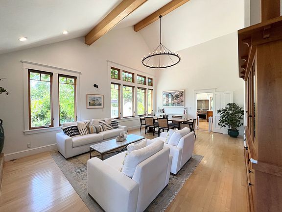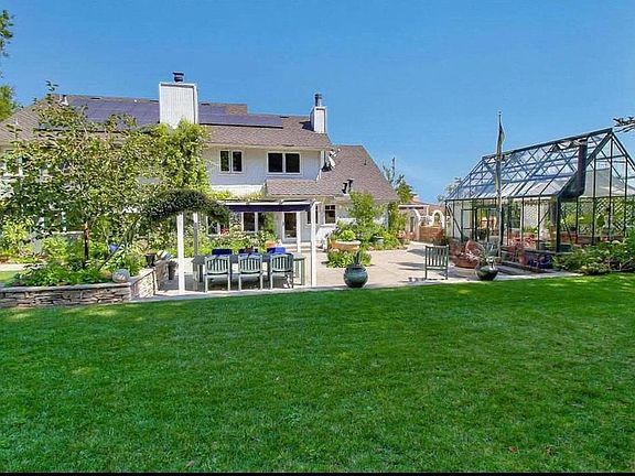 Outside, the landscaped yard feels like a private garden complete with mature fruit trees, olive trees, Japanese maples, winding paths, and multiple seating areas. A solarium, patio, lawn, and built-in pizza oven make the outdoor space as functional as it is beautiful.