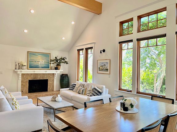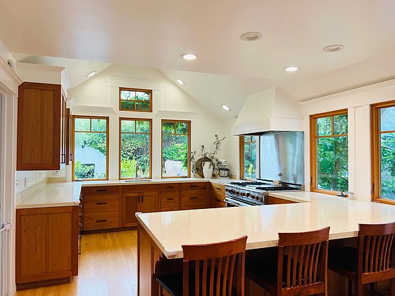 Upstairs, three large bedrooms with maple floors offer scenic views, including a glimpse of Mt. Diablo. The primary suite includes vaulted ceilings and an attached office with a fireplace, built-in desk, and serene views of the backyard. A main-floor guest bedroom with a separate entrance and full bath offers additional flexibility.