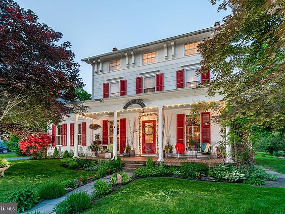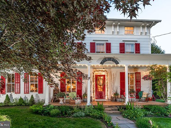 The Janney Armitage House, circa 1850, located in the Village of Woodsville, is a beautifully preserved pre-Civil War gem. The current owners undertook a full house renovation in 2016 to preserve the history of the property while adding unique complimentary living spaces and amenities. The front of the house features a bluestone walkway though perennial flower beds, an inviting covered porch with traditional painted blue ceiling, and original shutters accenting the floor to ceiling windows. A front stone wall, complete with horse hitching rings remains intact from when this home served as a local physicians’ office. Flanking the center hall staircase, the living and dining rooms radiate a warm and inviting ambiance featuring refinished oak flooring and decorative mantels, . The study/home office, with a wall of custom-built shelving, boasts a massive stone wood-burning fireplace, perfect for those chilly nights. The remainder of the first floor features a re-imagined kitchen, plus added mudroom and laundry/full bath. Handcrafted pipe and board shelves, a vintage farmhouse sink, distressed bead board trim, pine flooring, period lighting fixtures, a walk-in pantry with a screen door, and exposed reclaimed ceiling beams adorn the kitchen addition. The discovery of a second staircase during renovation provides a convenient back way to the bedrooms in addition to the main center hall staircase. The new laundry/full bath on the first floor has a rustic design with salvaged wood barn door, shelves, distressed corrugated steel walls, a vintage concrete double deep sink, custom exposed copper plumbing, a barrier-free shower, saltillo tile floor, and a stackable Miele washer/dryer set . Upstairs, the original hall bathroom was completely redone with vintage ceramic tile work reminiscent of the 1930’s and a large low curb tiled shower, all connecting directly to one of the bedrooms. An additional full bath on the second floor was added to the primary bedroom en-suite, envisioned to feel like an outdoor patio featuring wet room design with river jack stone flooring, a ball and claw cast iron tub, a stone wall to emulate an exterior bulk-head chimney to hold the shower fixture, shiplap Hardie board walls, a vaulted ceiling w/skylight, radiant heated flooring and a 1920’s Hoosier cabinet vanity with a bread bowl sink. Additional flexible bedroom or craft/office spaces are found on the remainder of the second floor and in the spacious third floor living space with original pine floors and exposed brick chimney. The top floor also includes 2 large storage rooms. Beyond the main house, the rear side porch leads to a charming red barn/garage with water and electric lines already in place. This unfinished outbuilding awaits the new owner’s imagination. The surrounding property, a haven for song birds and wild life, encompasses nearly ¾ of an acre, boasting multiple established perennial gardens, a mature wisteria climbing the front porch, azaleas, maples and towering hemlocks. The view from the back of the house opens to a series of adjacent fields that blaze with fireflies in midsummer. With new four-zone heating, upgraded fixtures and hardware, plumbing and electric, newer septic and a less than 10-year-old roof, this home is ready to welcome you to enjoy its rich local history and modern comforts. This peaceful retreat is located just minutes from Hopewell Borough and is an easy commute into Princeton, Pennington and Lambertville.