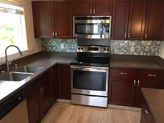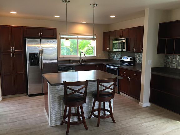 his is one of the best perimeter lots with a fantastic view of the West Maui Mountains in the sought after neighborhood of Traditions at Maui Lani. Located across from the Pomaikai Elementary School and just steps away from the community playground and water park is this nicely remodeled 2-story (unfurnished) single family home. The upgrades include all new porcelain tile flooring on the first level, vinyl laminate plank flooring on the second level, espresso kitchen cabinets with tile back splash, stainless appliances, Corian counters and a separate island that includes two matching bar stools. Off of the kitchen is the slider door that opens up to an enclosed back yard. The back and front yard have been beautifully landscaped with native plants, irrigation system and wrap around vinyl fencing with side gates for added privacy. There are 2 split air conditioners, 4 ceiling fans, window coverings throughout, solar hot water heater, photovoltaic net metering system ($25 mo average monthly electric bill), two car garage with storage racks, front load washer and dryer plus a laundry sink. This is an extremely convenient location near the hospital, schools, shopping and the Dunes at Maui Lani golf course and restaurant. No Smoking. No Pets allowed. Monthly Yard service included. Tenant to pay all utilities. Property Manager: Brandy Aki, PB Emerald Club Realty Inc. License #RB-17344 yard service Included. Rent plus 4% GET included.