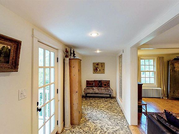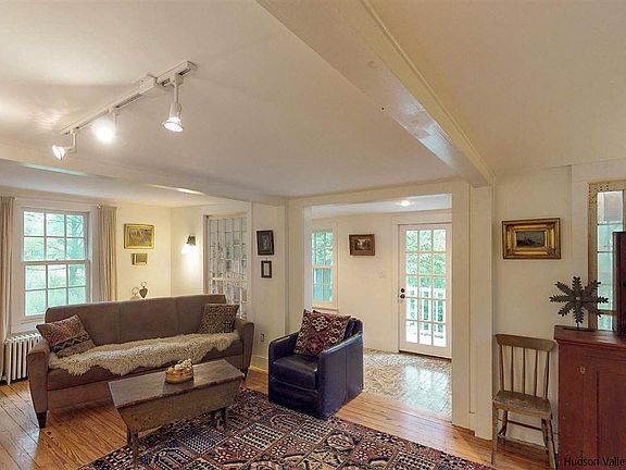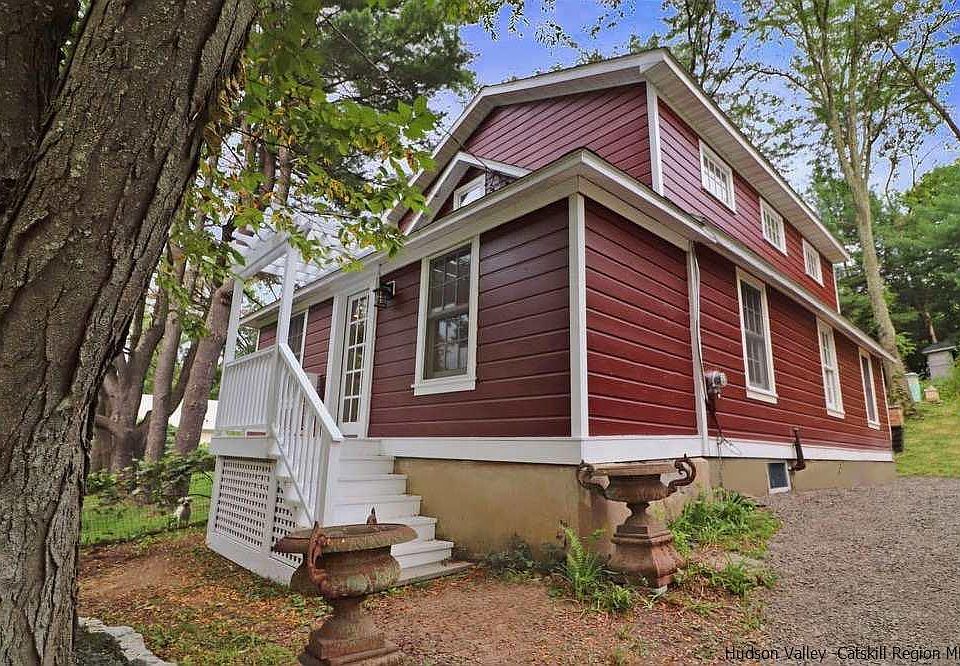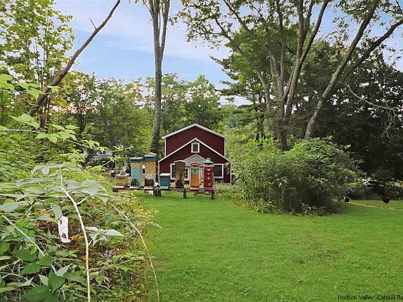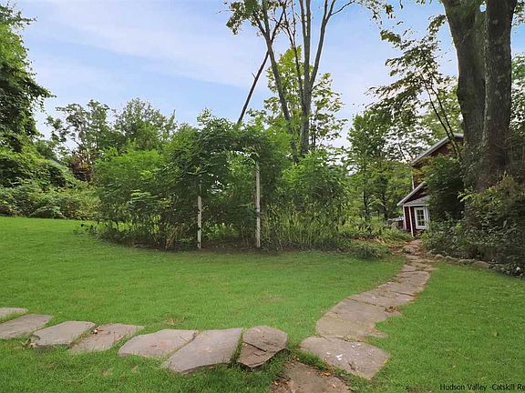 This idillic property owned by local artist and muralist was renovated from top to bottom in 2006, with all new insulation, new wiring and 200 amp electric box, new plumbing, new 8" novelty pine siding, new second story walls and roof with cathedral ceiling, rebuilt mudroom, new front porch, top of the line Marvin windows, fixtures, and appliances. Main level features generous front entry with hand stenciled floor, living room, bathroom, guest room, large country kitchen with hand stenciled wallpaper of what is growing in the garden (day lilies, ferns, pine trees, wild grape leaves) the dining room has hand punched copper cabinets and the mud room a hand painted mural. Upstairs there is a large master with cathedral ceiling, walk-in closet, room for ensuite bathroom, and large studio. Step outside into the edible back yard, with lawn, garden, fenced vegetable garden, honey bees, chickens, and goats. Just 2/10 mi from the Village of High Falls, with shops, restaurants, co-op. 2 min to the rail trail, 5 min to Stone Ridge, Mohonk Mountain House, and Spring Farm Trailhead. Under 2 hours from Brooklyn.
