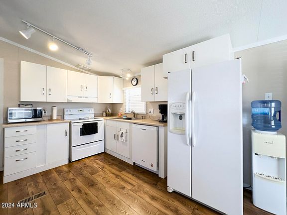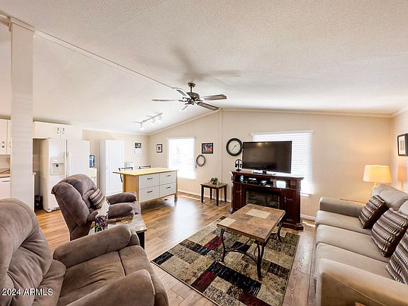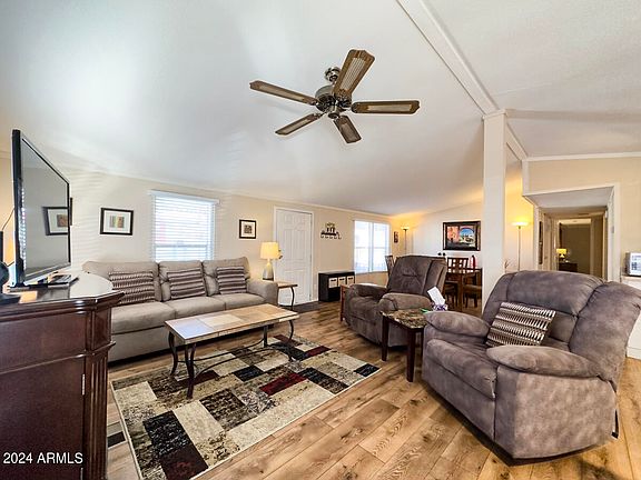 cabinetry/countertops, interior/exterior paint, etc. Ideal open concept floor-plan with front picture windows offers ample living space and natural light, a separate laundry room, formal DR plus two walk-in showers. Outside there is a full length covered patio, carport & storage shed. Enjoy friendly neighbors, a community pool, hot tub and clubhouse. Just minutes to shopping, banking, restaurants with easy access to Loop 202 and US Hwy 60. Base lot rent is $710 per/mo + water. Pets OK