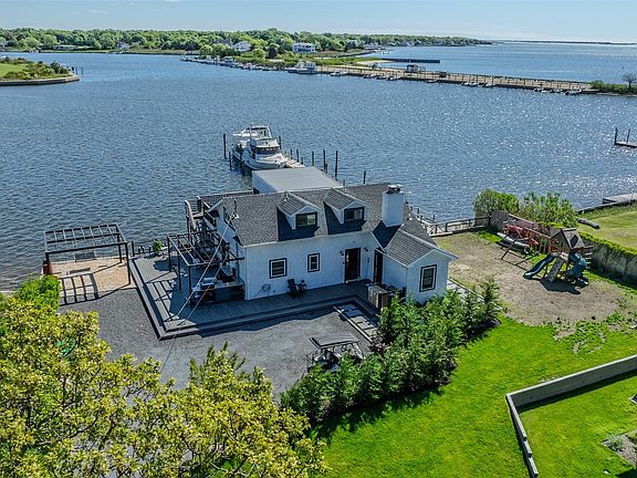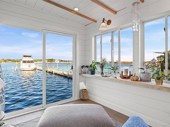 Experience the ultimate in coastal living with this extraordinary waterfront compound, privately nestled in the sought-after Holiday Beach community. This rare offering features a spacious main residence & a fully renovated guest cottage, perfectly designed for luxurious living and effortless entertaining.The main house welcomes you with a flowing layout that includes a dramatic great room, formal living room, elegant dining area, and a bright eat-in kitchen. The expansive primary bedroom boasts its own private terrace with stunning water views, while two additional bedrooms, a dedicated home office with its own bathroom, 2.5 more baths, and a full laundry room complete the interior. Step outside onto multiple levels of decks that offer panoramic views and unforgettable sunrises over the water. The guest cottage is a retreat in itself, beautifully renovated with vaulted ceilings and sophisticated finishes. It features a large ensuite primary bedroom with a generously sized walk-in closet, a versatile second bedroom/loft, and an open-concept family room with a cozy fireplace and dining area. The high-end eat-in kitchen is a chef’s dream, outfitted with sleek stone countertops, custom Ciuffo cabinetry, and premium stainless steel appliances. The cottage also includes its own laundry area and private garage. Outdoor living is just as impressive, with a stylish cabana with shower, a cold plunge pool or tub, and expansive decking that invites relaxation and entertaining. A deepwater dock extends 150 feet and includes water and electric, offering easy access to the inlet and bay for boating enthusiasts. Additional features include ductless air conditioning, central vacuum system, and deeded beach rights to Holiday Beach. Located just minutes from the Hamptons, this exceptional property provides easy access to world-class shopping, dining, and pristine beaches, all while offering the privacy and tranquility of a waterfront sanctuary. Call today for a private showing.