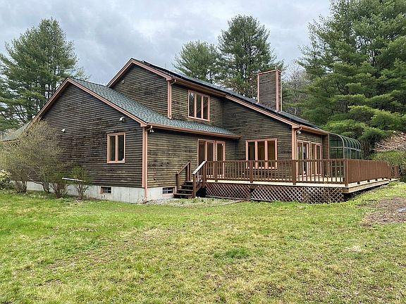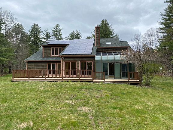 Custom built in 1992, this contemporary house is unique for the area. Set back from the road the home comprises of a great room with large windows looking out onto the very private 2.3 acre lot. The generous kitchen is fully equipped with plenty of drawer and cupboard storage. The separate dining area offers a more formal setting to enjoy mealtimes. The glassed sun room has views across the rear of the garden to the tree lined boundary. The Master bed on the 1st floor with attached bathroom is located to the rear of the property with a further 2 bedrooms and separate bathroom situated off the upstairs gallery. Unfinished space above the 2 car garage can be used for storage or finished as another bedroom or study. Solar panels facing south offer substantial free electricity plus money back every year from RECS. Tools, snowblower or riding mower can be stored in the large shed that has a full cement foundation. 50 year warranty roof installed about 8 years ago. High efficiency furnace about 7 years old. New water filtration system. New deck. 1x Full Bath, 1x 3/4 Bath, 1x 1/2 Bath