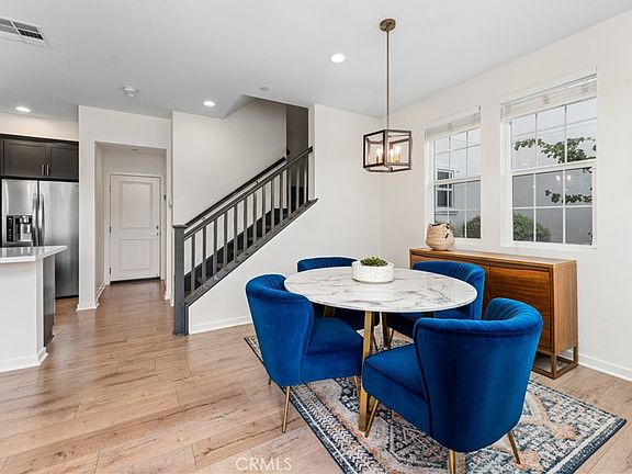 This is the gorgeous Aurora town-home, You have been waiting for. Award Winning community of Rancho Mission Viejo steps from Esencia School, Canyon House Coffee, Pavilion Park, Gymnasium and South Plunge Pool. The quaint farmhouse inspired exterior welcomes you to this beautiful property perched on a ridge offering views of the surrounding hills and neighborhood. Inside the light filled interior, gorgeous laminate flooring throughout both floors, recessed lighting, upgraded cabinetry and a neutral palette throughout the open concept floor plan, provide a perfect home for indoor-outdoor lifestyle. The heart of the home is the light filled kitchen with dorian gray upgraded shaker cabinetry, white quartz countertops, Marble stone tile backsplash, high-end stainless-steel appliances, . The oversized front patio area is larger than standard and creates a perfect indoor-outdoor living space for entertaining and relaxing with family and friends. Upstairs, primary with a private deck perfect for relaxing and enjoying the sunset views, ceiling fan, a large walk-in closet. Upstairs also includes two bedrooms, one with a custom ship-lap wall. The laundry room is conveniently located on this upper level. RMV is resort style living with community amenities, multiple clubhouses, pools, workout facilities and gathering spaces with year-round community events for all ages including award winning Hilltop Bar & Pool, North Plunge, Esencia Sports Park, Frisby Brewery, Sendero Marketplace, Esencia Farm, and more.