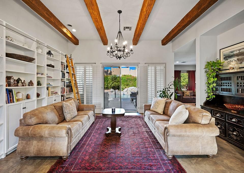 Private Southwestern oasis, nestled in a prime central location that combines convenience with serene luxury. This meticulously landscaped gem is adorned with lush fruit trees and vibrant flora, providing a picturesque backdrop for every window view. Step into a grand residence where rustic elegance meets modern comfort. The formal living room, accentuated by stunning exposed beams and a cozy library, offers an inviting space for intellectual pursuits. The open floor plan seamlessly connects living areas, creating an entertainer's paradise. Host memorable gatherings in your private dining room. Generously sized primary bedroom featuring a spa-like ensuite bath. Three additional guest bedrooms ensure everyone has their own sanctuary. One guest room boasts an attached full bath, providing an ideal retreat for visitors.Energy efficient with fully paid-off solar, with modern amenities including stainless steel appliances and gas cooktop. Just a stone's throw from top-notch restaurants, shopping, and the BNP Tennis Gardens, convenience is truly at your doorstep.Outside, immerse yourself in a private haven where every detail has been curated for your enjoyment. Listen to the soothing sounds of a waterfall as it cascades into the sparkling, crystal-clear pool and spa. This home isn't just a place to live--it's a lifestyle, a sanctuary, a dream come true.Seize the opportunity to own this extraordinary blend of Southwestern charm and contemporary luxury. Your private paradise awaits!