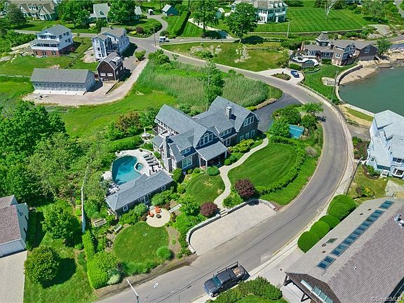 RARE ONE-OF-A-KIND HOME IN PRESTIGIOUS SACHEMS HEAD! Experience warm breezes, fun times and making memories in this custom designed and built home. This stunning home offers water views from all sides including marsh views in the back. This home offers 4 bedrooms, 3 full and 1 half baths. One of the only homes in the area with an inground pool, pool house that includes a kitchen, half bath with laundry room and multiple patios and decks for exceptional ease in outdoor entertaining. A non-slip basket ball court adds to the outdoor fun. The 3 car garage has epoxy floors and a lift for a fourth car. The inside amenities will knock your socks off! State of the art lighting and blinds open at a touch. The gourmet chef's kitchen features high-end Viking appliances including a wine cooler and separate bar area. The kitchens center island, granite countertops and a breakfast nook open to a spacious living room with fireplace and views of Long Island Sound. Featuring beautiful wood floors, large windows and glass doors to allow natural light and views to bathe the interior. First floor office boasting coffer mahogany ceilings, paneled walls and custom designed built-ins. A light filled sun room/family room, mudroom with custom cabinets/pantry and formal dining room round out the main floor. Stepping upstairs the sumptuous master bedroom has a private deck with water and pool views, an incredible bathroom with soaking tub and shower plus amazing his-and-hers closets. The other 3 bedrooms are en-suite, one with a Jack and Jill bath. The laundry room is stylish with utility sink and conveniently located on the second floor. This home sits on a double lot, totaling .60-acre. An area around the home is fully fenced in and provides fabulous outdoor spaces with multiple patios and dining areas, surrounded by lush landscaping aside an in-ground, heated, Pebble Tec pool and spa. The pool house offers a kitchen, half bath, laundry and Nana-Wall glass doors which easily slide open. Sachem's Head Association provides access to beach, tennis, paddle tennis, kayak rack and boat launch. Sachem's Head Yacht Club is right around the corner! A tranquil location not far from downtown historic Guilford Green and 90 minutes to NYC and 2.5 hours to Boston. LOW FLOOD INSURANCE... only $700/year and is transferable to new owner!