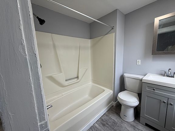 Durable grey wood-style flooringBeautifully renovated first-floor apartmentLarge eat-in kitchenUpdated lightingUpdated bathroom fixturesSpacious unitCrisp white cabinetry