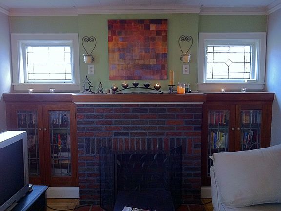 Large family room with great mantle, leaded glass windows, and built in bookshelves. Large bay window lets plenty of light in!