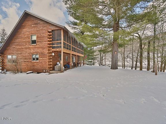 GORGEOUS DELAWARE RIVERFRONT LOG HOME ON 3+ ACRES! Located in a private, park like setting, come experience nature's flora & fauna at this incredible property! The beautiful log home features vaulted tongue & groove ceiling, open floor plan with pine floors, spacious living room & cozy woodstove, nice dining area & eat in kitchen. First level master bedroom with double closet, full bath and large sunroom with hot tub ready for you to enjoy! 2 additional generous bedrooms, 2nd full bath, office area & huge screened balcony overlooking the river! Full basement for extra storage or future expansion! Take the gentle walk to the river & enjoy world renowned trout fishing, swimming, kayaking, tubing & more! Quiet setting, ideal for a riverfront retreat or year round sanctuary!