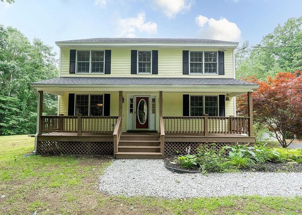 UPDATES ALERT! Entire interior painted and new carpet throughout! Sprawling home nestled in nature with easy access to Granite Rail Trail, Rt 13 & 101. This custom-built home is ideal for busy family, professionals, or anyone looking for space. Kitchen features new stove & 2-year-old microwave. New flooring in bathrooms and laundry. Back deck, front porch & stairs above detached garage freshly sanded & stained. Charming farmers porch & private backyard add to ambiance. Main floor includes dining room & private office with fiber optic available. Open-concept design at back is perfect for large gatherings and adjoins full-width deck with propane grill connection. Upstairs, primary suite spans the depth of the house and includes 3 spacious closets & convenient laundry with dual fuel dryer (propane/electric). 3 additional bedrooms & another full bath complete 2nd floor. Includes detached 3rd car garage/workshop with 60-amp service, storage shed & additional space under deck. Updates include 4-year-old roof and a large driveway with a turnaround pad. This bright and inviting home offers dual fuel heating (pellet stove/pellets included), A/C, irrigation, Culligan water softener, attic fan & heated 2-car garage. Move-in ready with many updates, including fresh paint in entire interior & new carpet. Furnace, A/C, septic tanks, pellet stove, sprinkler system & water softener all serviced in June of 2024. Enjoy the natural wildlife, showings begin 7/21/24 at OH.