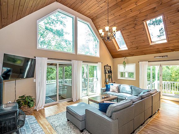 Live here, play here, work here, invest here. This contemporary chalet in Bartlett can be your basecamp for mountain living. Close proximity to Attitash Mountain, Cranmore Mountain, Black Mountain and Wild Cat Ski Area, river swimming, shopping, dining experiences and Story Land. This home has a robust rental history. Three levels for enjoyment. Walk into the first level, where you find find a large primary bedroom, two more bedrooms, a full bath and utility room. Travel up the stairs to the next level where a sun filled living room, with sliding doors to a screened in porch and deck beckons you. The fanlight windows above sliding doors let in lots of light and the brick hearth provides ambiance. The living room is open to the kitchen and there is a separate dining room. Wood ceilings and floors are found throughout the home. Skylights adorn the bright bonus room on the third floor. Home is being offered fully furnished. Looking for four season adventure? Put this home on your list to see!