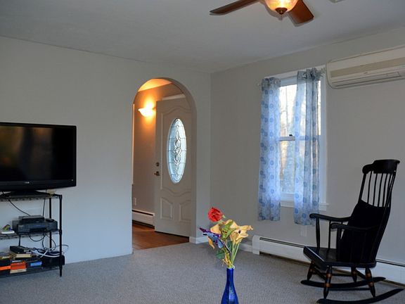 Spacious Cape, freshly painted and ready for new owners! You'll love the vaulted ceiling in the living room. Cozy up to the fireplace or relax in the den. Both full bathrooms have been renovated. First floor bedroom and dine in kitchen round out the first floor. Second floor landing can double as a great office space, playroom, or reading nook. Primary bedroom gets filled with light from the palladium window and access to the juliet balcony. Third bedroom with wall to wall carpet rounds out the second floor. Mini Split AC units. Garage. Firepit, stone patio, outdoor shower, shed, lean to for wood storage, jacuzzi hookups and deck give you plenty of options for entertaining. The large backyard has plenty of room for gatherings and privacy. Basement partially framed for office or game room. Roof roughly 15 years old. Boiler roughly 8 years old. Come see for yourself!