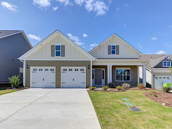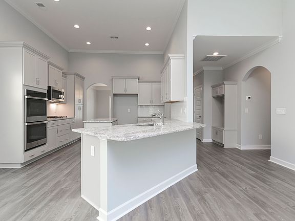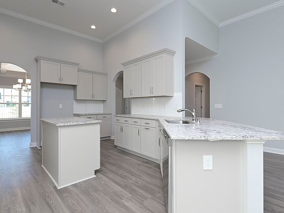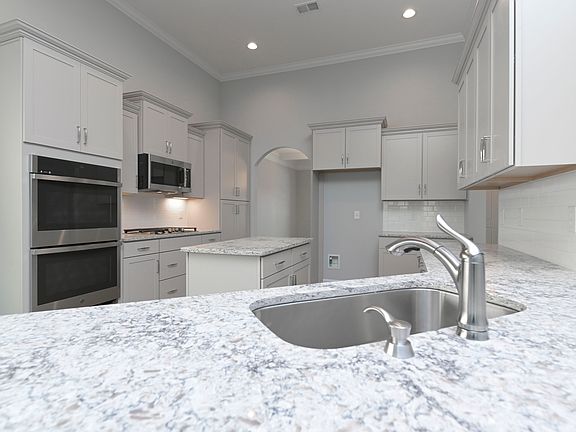 The Fairchild elevation B is a Craftsman-style three bedroom, two bath, one-level home. The kitchen has a large peninsula with bar top which is open to the great room and an arched pass-through leads to the formal dining room. The primary suite overlooks the back yard. The primary suite features a large walk-in closet, linen and water closet. The secondary bedrooms share a full bath and are adjacent to the laundry room.