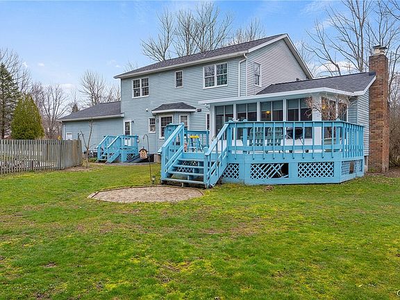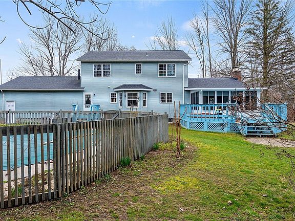 Welcome to this beautiful colonial home! Located close to all conveniences, but tucked away on a low traffic, neighborhood street. Upon entering the foyer you will see a spacious formal dining room with hardwood flooring and your formal living room complete with new carpeting. You will then enter your very large eat in kitchen which offers ample storage in the oak Wood-Mode cabinetry. The newly carpeted family room has a cozy wood burning stove that is built into brick and wood shelving. Through sliding glass doors, you will find a relaxing Florida room overlooking your deck, 2 acres of land and inground pool. Your half bath and laundry are on the main floor as well. Up your freshly carpeted stairs you will see the primary bedroom and 3 other good-sized bedrooms all with hardwood flooring. Including a full bath and linen closet. Plus, a full unfinished basement with endless possibilities. Updates include the following: Roof, Furnace/AC unit, Generator, Front Door, Florida Room, New pool heater and pool liner, Sump pumps.