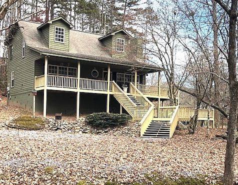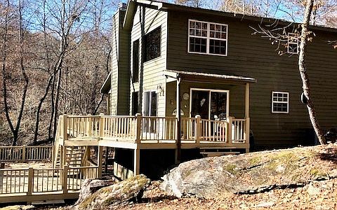 Magnificent creekfront home.You will fall in love with this one of a kind setting for this 2 story chalet home with Shooting Creek in front and Hogsed branch running down the side. Home is in excellent condition with lots of porches and multiple decks to enjoy the sounds of the creek. This 3.53 acres has surrounding natural beauty with large natural rock formations. Property is both sides of creek. Lots of storage in the garage. If you love rainbow trout then take your fishing pole to the creek and catch your own dinner. Hurry on this one