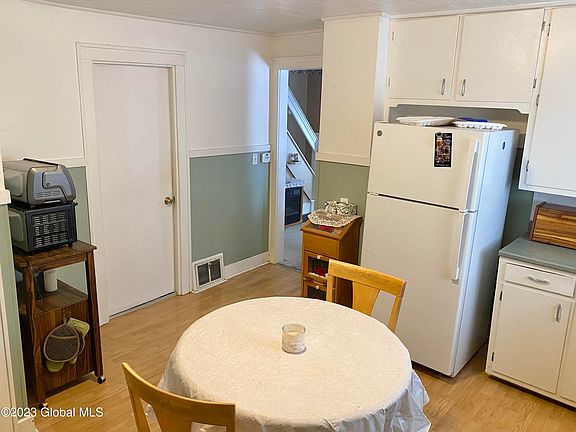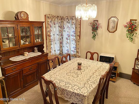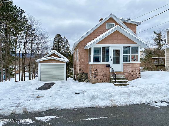 This charming bungalow is located on a desirable dead-end street in the City of Gloversville. This home features 2 bedrooms, 1 full bathroom, a formal dining area and a spacious finished basement complete with a pellet stove. Newer stainless range in kitchen. This home is being offered AS IS.