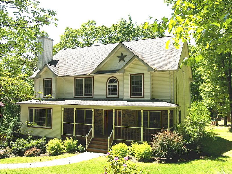 Country Colonial home situated on 3.3 private acres with a rocking chair front porch to relax and enjoy the nature that surrounds this home. Custome Cultured Stone covering front porch.First floor features a Living Room, Den/Office, Dining Room w/ elegant glass door to 40x16 deck, Kitchen w/ a center island w/bar sink,dining area, Family room w/a pellet stove insert, all rooms w wood floors & stained woodwork. Master bedroom w/ a palladium window & skylight, 2 w/ in closets, master bath w/ skylight, Jacuzzi tub, tiled shower, double sink vanity &private commode. Three bedrooms & full bath complete the second floor. Lower level is an oversize two car garage w/ workshop area, recreation room and utility/storage room. Paved driveway with additional parking area lead to this beautiful home.