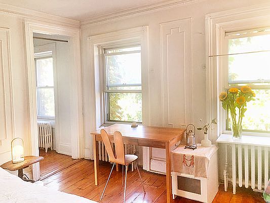 The top floor of an owner-occupied brownstone, this apartment is quiet and sunny, on a pedestrian block near Rhodora Wine Bar and Fort Greene Park. It has lots of detail, like skylights, marble mantels, decorative ceilings, and old wood floors. There's a big bedroom and living room plus a galley kitchen and a smaller room off the bedroom that has been used in the past as a darkroom, large closet, or small office. The building is on a pedestrian block near Rhodora Wine Bar and Fort Greene Park, with neighbors who are friendly and respectful of each other's privacy. We share laundry and wi-fi. The apartment will be updated after it becomes vacant at the end of December with a new refrigerator, bathtub, fixtures, and kitchen floor.