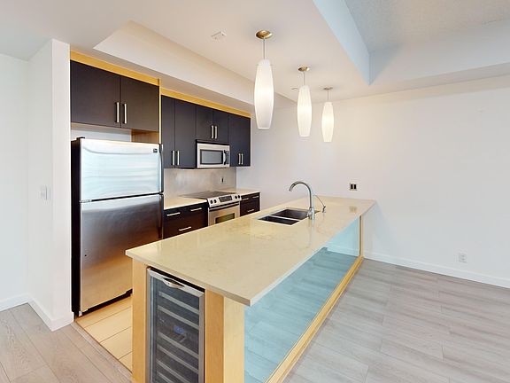 AboutWelcome home to your luxurious 2-bedroom, 2-bathroom suite in Castello! Situated in the heart of the Beltline, you are located in the midst of Calgary's premier entertainment district, just steps from nightlife, fabulous dining, trendy cafes, pubs, diverse shops and much more right at your doorstep. You are also only a few blocks to the famous Red Mile, Calgary's premier entertainment hub. This beautifully updated and well laid out residence truly has it all.Upon entering, you are greeted with 9 ceilings, a chef inspired kitchen featuring quartz countertops, stainless steel appliances and a generous amount of cabinet space, complete with a dedicated wine/beer fridge. The large peninsula island has ample space for cooking and entertaining with additional seating for your guests. This open-concept design transforms the dining and living area into the heart of your home and is perfectly centered around the expansive floor to ceiling windows with panoramic city views that will be the envy of all your guests. Unwind or host summer BBQs on the MASSIVE glass railed balcony featuring a gas line for your BBQ, stunning views of downtown and a little slice of the mountains as your backdrop!Relax and recharge in your elegant primary suite that exudes sophistication and boasts a luxurious feel as soon as you enter the room. Boasting a generously sized room, you'll be amazed by this stunning ensuite with double vanity, sleek glass enclosed shower, and a massive walk-in closet that is all seamlessly and conveniently connected. The second bedroom is perfect for guests or an office and is ideally situated right next to the second full bathroom. The living area has ample cabinet space and also features a pocket office with built in cabinetry, perfect for your home office space.This condo comes complete with one underground parking stall and one storage unit in the secure and heated underground parkade. You'll love the convenience of the covered off- street parkade exclusively for your visitors.Whether you are heading Downtown or to the mountains, commuting is a breeze with easy access to all over the city. This condo will compliment your active lifestyle as you are conveniently located on the bike path. Castello is loaded with amenities, residents enjoy a well-equipped fitness studio, guest suite, common room, car wash bay, daytime concierge and visitor parking.