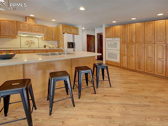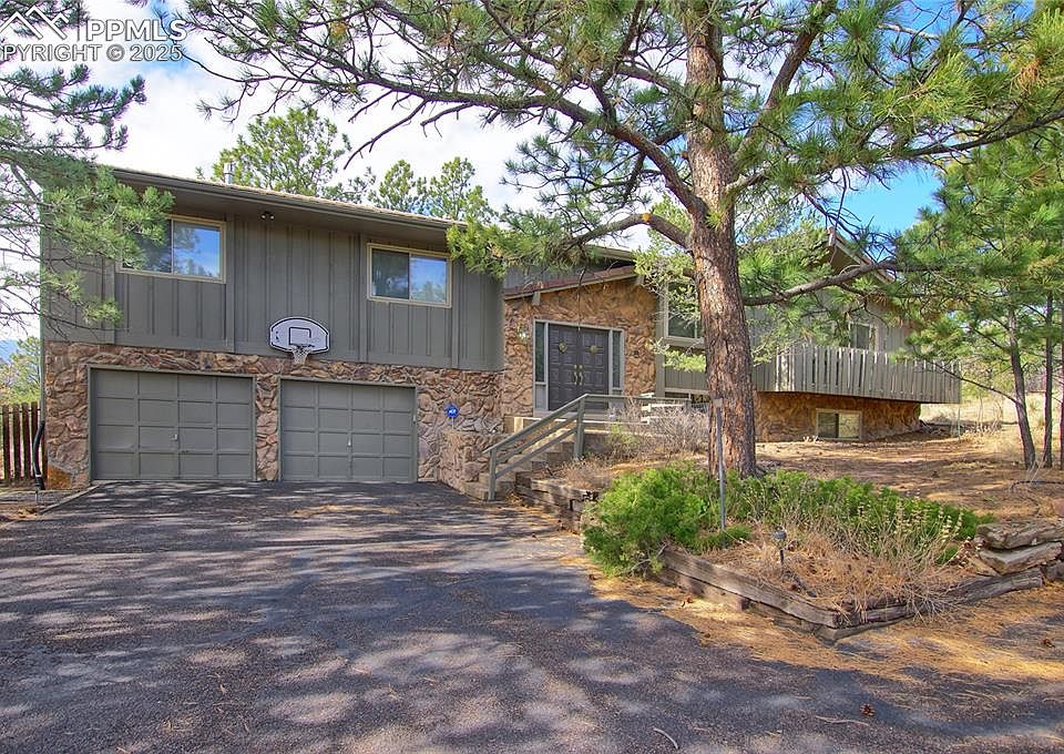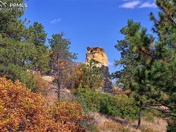 One of a kind custom home with very private setting on a cul de sac featuring amazing Peak views with nature all around but close to town. Hiking paths adjacent to property, Fenced acre of pine & oak forest behind the house. Wildlife abounds. Special features include abundant private parking for guests & visitors, extra outside lighting for the driveway & the garden, fenced garden with flagstone patio. No neighboring homes on 80% of the surrounding land. Nature & rock formations are all around. Large decking is along the entire back of the home with another deck in the front. Automatic patio awning is along the back. A Fire hydrant is located at the driveway & fire station is within a mile. Fireproof & hail resistant concrete tile roof is installed. No yard to maintain with natural Colorado landscaping outside of the garden area. Sprinkler system & small pond in the garden is suitable for small fish. Champion windows throughout with double insulated blinds facing west. Custom stained glass in entry with gleaming hardwood floors & high ceiling. Custom bookcases are installed in the recreation room. Tile, hardwood and carpeted floors are throughout this amazing bi-level 5 bedroom, 3 bath home with 3 fireplaces- one is gas and two are wood burning & set in natural stone walls. Spacious primary suite has a gas fireplace & additional sitting room. Updated walk-in glass shower has Peak views from a private large window. Vaulted ceiling in the family room has wood beams, wet bar on lower level has a refrigerator. Glassed in spa room has hot tub and nature views. Wine shelves are staying in 5th bedroom. Central air/heat extends throughout. Heated garage has a storm cellar/safe room and 2 rooms for storage, abundant cabinetry & work benches. Kitchen has double ovens, food warmer, trash compactor, upgraded cabinets, Silestone counters & a wall of pantry space recently added. School district 20, elementary & middle school within walking distance. Welcome Home
