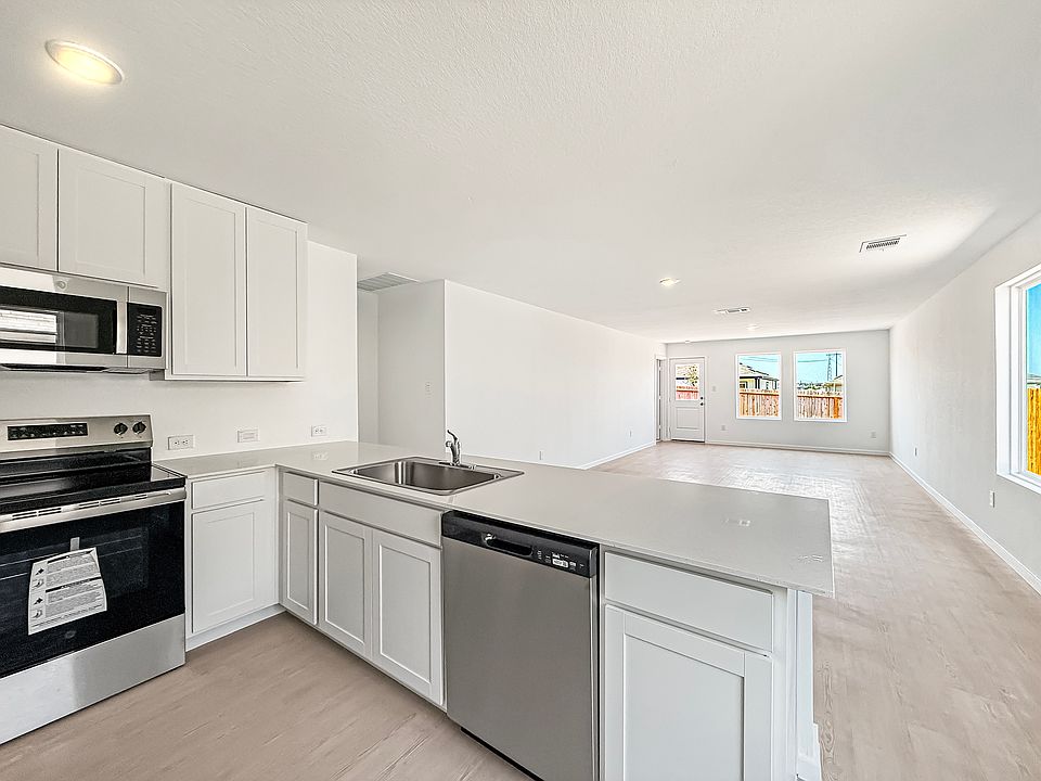 Cozy carpetOpen-concept floor planWood laminate flooringStainless steel appliancesQuartz countersModern kitchenPlenty of cabinet space