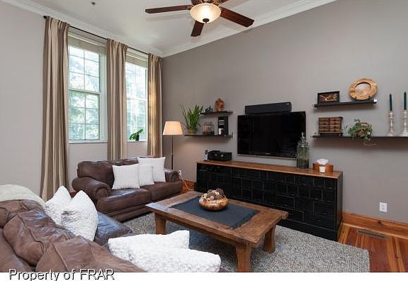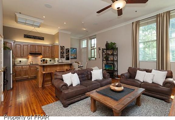 -New York City Style in Sanford NC! Enter to 12 ft ceilings, beautiful pine floors & large windows with marble window sills. Open living room, dining area, chef's kitchen is incredible with gourmet appliances, skylight and huge pantry as well as a bar area. Master bedroom with huge walk in closet, master bath just updated with glass block, dual shower heads & heated towel bars. 2nd bd & ba with walk-in closet, detached dbl garage w/getaway guest room/ with bath, brick patio, walk to downtown!