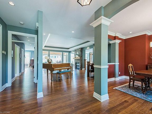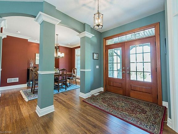 This exquisite home in Sunningdale is ready to start summer with a new family. Located on a quiet street adjacent to the Sunningdale Golf & Country Club, this home has been beautifully landscaped, including a large rear garden, shade sails and salt water hot tub. The open concept floorplan is perfect for entertaining, and meticulous attention has been paid to outstanding finishes and thoughtful touches, including cherry cabinets in the gourmet kitchen and rich bamboo and ceramic flooring on the main level. The kitchen has been wired for sound, and includes an oversized island and a double-sided fireplace facing the large great room. Downstairs includes 2 beds (w/egress windows) and a 3 pc bath, plus a rec room. Retire to a master with a spa-worthy ensuite (the main bath is also fabulous!) and huge WIC. Practical touches include accessible features, solar Microfit contract, mud room, garage access to lower level, shed with electrical, and more. Book a private viewing today!