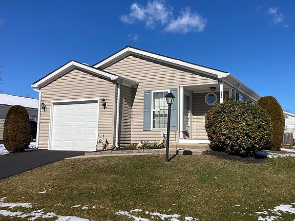 It's a great home at a great price!  This nicely landscaped and comfortable, 2 bedroom/2 bathroom, Lahaska model home with garage is now available in the 55+ Community of Buckingham Springs. You can pull straight into your one-car garage and easily move your groceries from the car directly into your kitchen.  The huge eat-in kitchen with an island includes major appliances and loads of cabinets for storage.  The kitchen opens to a spacious dining room with a chandelier and leads into the living room with a front entrance.  The sizable two bedrooms are just off the hallway which also has a guest bathroom with vanity, commode, and shower over tub and a primary bathroom with double-sink vanity, soaking tub, commode, and shower stall.  The best news is that this home comes with a new roof, a new water heater, newer doors, and custom vertical blinds in most rooms.