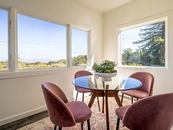 Spectacular San Francisco Bay views, architectural design, and exceptional level outdoor space distinguish this impressive Emerald Hills home. The extra-large lot, comprising two parcels, offers a sweeping entertaining deck and a patio plus vast synthetic lawn for play, a rare feature in this community. Rebuilt in 1992 and freshly updated, the home showcases dramatic volume with cathedral ceilings, walls of glass framing the views, and hardwood or wood-like floors in most rooms. Formal living and dining room with fireplace and built-in cabinetry opens to a Bay view deck. The kitchen has freshly painted cabinetry, a skylight, and a convenient pass-through to the casual dining room allowing Bay views from both areas. The inviting family room, also with Bay views, opens to an expansive deck and patio, plus there is a customized office and flexible-use finished bonus room. Three bedrooms on the lower level include a primary suite. There is also a large laundry room, street-level 2-car garage with EV outlet and direct access to the home, plus air conditioning. This home is near members-only Emerald Lake Country Club, acclaimed Roy Cloud Elementary, and Highway 280 for access to Silicon Valley or San Francisco.