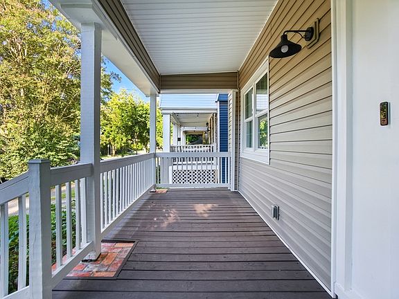 First floor primary bedroomHigh ceilingsFully remodeled bathroomSpacious front porchDining room