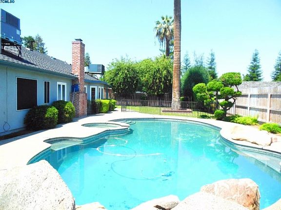 RARE BEAUTY! Come see your potential future in this large majestic home on Border Links and Lombard near the Visalia Country & Golf Clubs! This beautiful home has almost 2600sqft living space for the entire family to have their own private space. Along with the 5 bedrooms, there are 3 bathrooms and a powder room right off the indoor laundry area overlooking the covered under-roof patio. Amongst the vaulted ceilings you will find a fireplace for cozy nights, built in cabinetry, separate living and family rooms and 3 separate HVAC units to keep each section of the large home cooled as you please. Not only is the roof 50 year, The oversized 2 car garage has an area for RV parking and no neighboring home to the north for extra privacy. The majestic pool has rock water fall and an attached built in spa; this backyard was built for entertaining and relaxation whenever one pleases. The entire lot consists of a quarter acre, ready for you to make it your own home. Don't delay...call today.