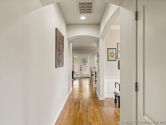 Nestled in the desirable neighborhood of Woodcreek Villas, you'll find this beautiful 4 Bedrooms, 2 Full and 1 half bath home that exudes both charm and comfort. New roof in 2019. Downstairs AC unit and all ductwork replaced in 2020. New Tankless water heater 2020. Most windows have been replaced with newer Pella series 250 windows. The home boasts a spacious open floor plan featuring gleaming hardwood floors, crown molding, arches and abundant natural light throughout. The kitchen is open to a cozy informal living room with a gas fireplace. Granite countertops, newer appliances and island seating make for easy casual dining. Both spaces overlook a covered backyard patio with ceiling fans perfect for outdoor dining, enjoying quiet evenings, or entertaining guests. Privacy fence has a gate that allows direct access to the adjacent soccer field! First floor also includes a formal dining room, the main bedroom, and a Family SAFE-Texas Tech F-5+ rated Tornado Shelter, all accessible from the front hall. The primary bedroom offers a serene retreat with a spacious en-suite bathroom, complete with soaking tub and a separate walk-in shower. Primary closet is an oversized custom appointed walk-in with storage galore! At the top of the stairs you'll find a landing space that's a perfect reading nook or study area. The second and third bedrooms are on the second floor and share a full hall bath. Fourth bedroom is a versatile bonus room that could also be used as a gameroom/office, and has walk out attic storage. The home is situated on a corner lot across the street from a children's playground & is less than two blocks from the neighborhood swimming pool. Sidewalks and a convenient walk to Jenks West Schools make for such an ideal location. Seller is related to listing agent.
