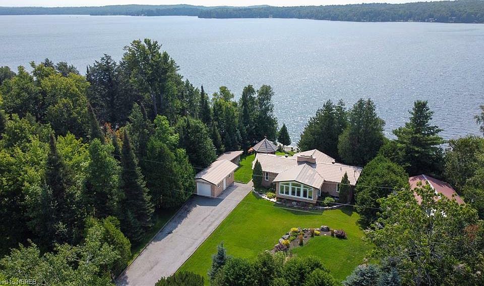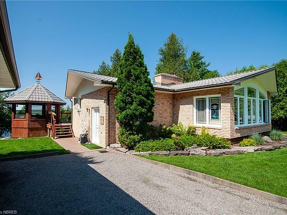 Lake Nosbonsing Gem! Welcome to this gorgeous waterfront property and home on beautiful Lake Nosbonsing! This one-owner, 1+3 bedroom, 2 bathroom custom brick bungalow with detached garage is sure to impress. The main floor features a unique layout with soothing comfort and warmth from its cozy living spaces and beautiful alder hardwood flooring throughout and features a large living room with a brick accent fireplace and patio doors to the full-length deck overlooking the lake. Spacious kitchen with ample cupboards/counter space, large island and skylight bringing in natural light, a formal dining area overlooking the back family room with private garden views and vaulted ceilings. The primary bedroom and 5pc bathroom with jacuzzi tub complete the main floor. The lower level features a sizeable rec room with a wood stove and full walkout to a covered interlock patio area leading down to the lake. 3 well-sized bedrooms, 3pc bath, laundry room and storage/mechanical area under the main foyer. The exterior is sure to please with a 12' x 12', 3-season lakeside gazebo, terraced landscaped waterfront with a large level pea stone firepit area by the shore and waters edge patio connecting to the aluminum dock. Firm sandy bottom with a gradual drop, ideal for kids and enjoying the lake. Fully landscaped property with irrigation, low maintenance brick exterior, metal shingles on the house and garage, backup generator, 12' x 24' garage, large woodshed and ample parking. Enjoy great boating, fishing and winter snowmobiling from your own northern oasis, only 25 min to North Bay in sought-after East Ferris. This property really does have it all and has been immaculately kept inside and out. Come see for yourself!